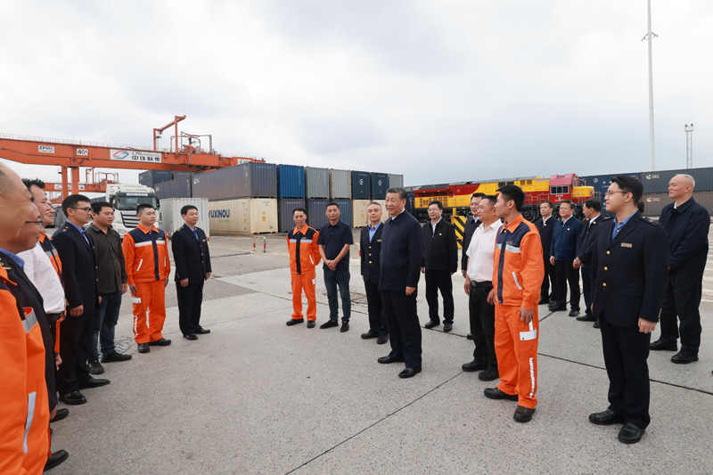 隨后,習(xí)近平來到重慶鐵路集裝箱中心站,聽取貨物集散、運輸路徑、運營成本和效益等介紹,同貨車司機、列車司機、裝卸工人、場站管理人員等親切交流,詢問他們的工作強度、勞動保護、節(jié)假日休息和收入情況。習(xí)近平說,大家在物流一線,也是在對外開放一線,通過你們的辛勤勞動,很多商品跨越山海、走向世界,你們的工作很有意義。推動西部大開放、促進(jìn)西部大開發(fā),物流很重要,大家要繼續(xù)努力,不斷創(chuàng)造新的業(yè)績,作出新的貢獻(xiàn)。